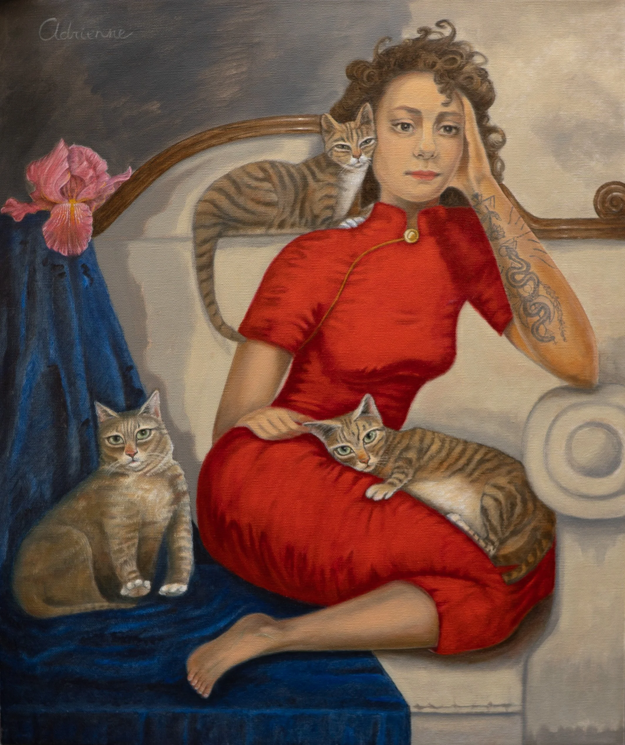 Woman with Tuxedo Cat and Red Wallpaper, 2023